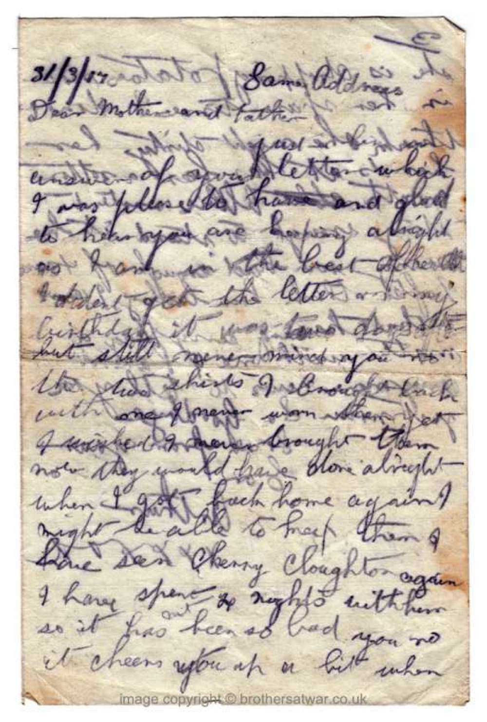 I have seen Cherry Cloughton again. I have spent four nights with him so it has not been so bad. You know it cheers you up a bit when [you] see someone you know. He has gone back to the trenches again now so I might see him again, might be shifted by the time he comes out again.